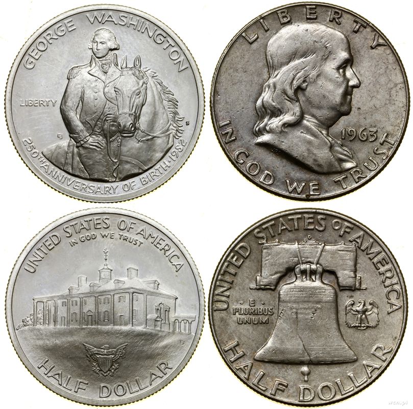 Opis: | Stany Zjednoczone Ameryki (USA), zestaw: 2 x 1/2 dolara, 1963 i 1982, Filadelfia, 1) typ Franklin 1963 (III+/II-) 2) 250. rocznica urodzin Jerzego Waszyngtona 1982 (I-) |
