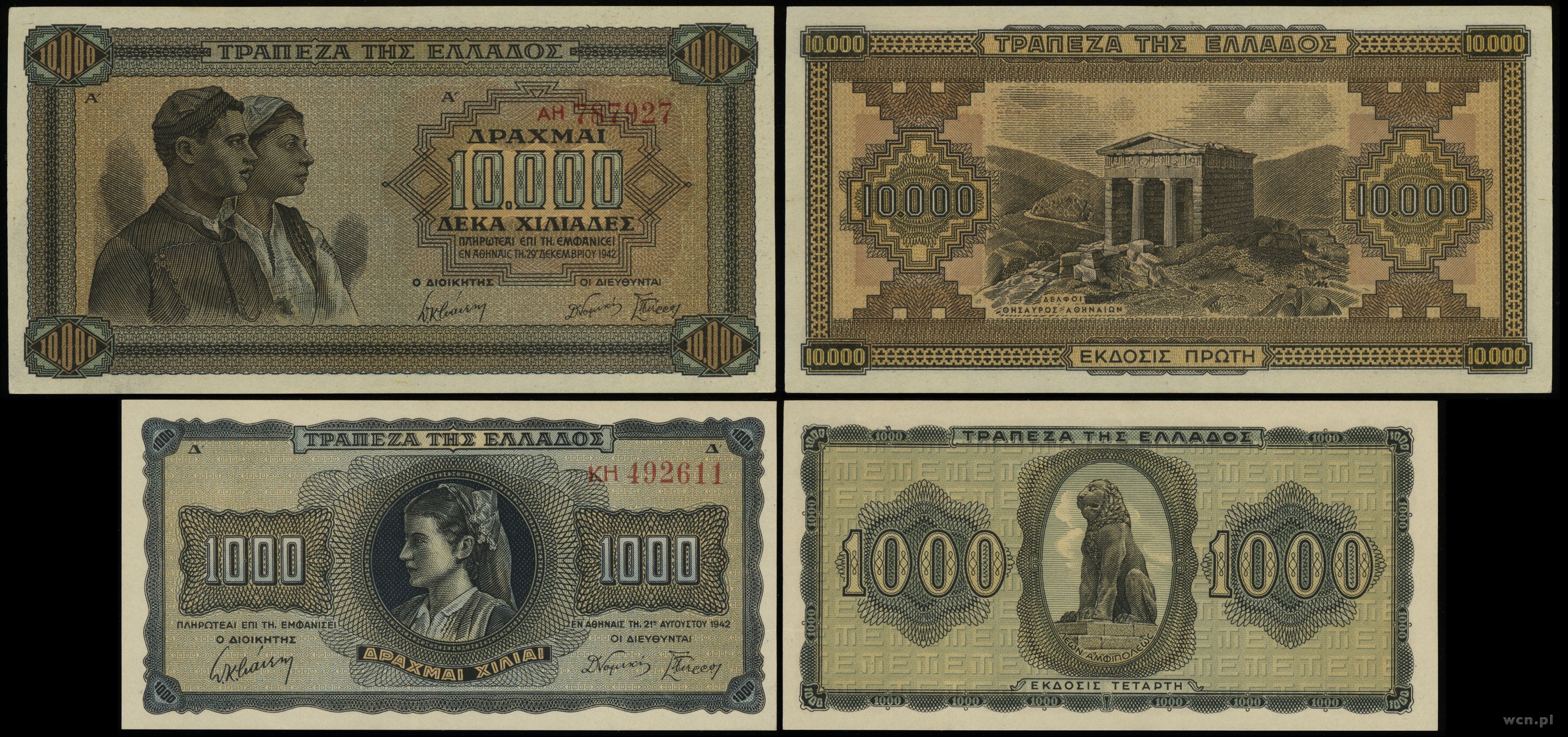 Grecja, zestaw: 1.000 drachm i 10.000 drachm, 21.08.1942 i 29.12.1942