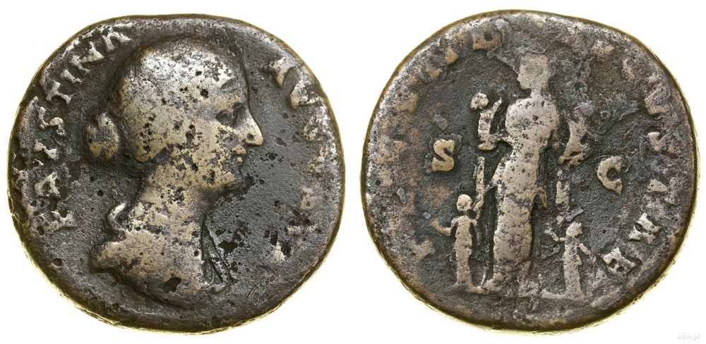 Opis: | Cesarstwo Rzymskie - Faustyna II Młodsza (147–176) – córka Antoninusa Piusa, żona Marka Aureliusza, sestercja, (161–175), Rzym, Aw: Głowa cesarzowej w prawo, FAVSTINA AVGVSTA, Rw: Fecunditas stojąca w lewo, trzymająca na rękach dwoje dzieci, po bokach stojące dwie dziewczynki, FECVND AVGVSTAE, w polach S - C |