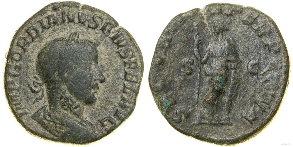 Opis: | Cesarstwo Rzymskie - Gordian III (238–244), sestercja, (243–244), Rzym, Aw: Popiersie cesarza w wieńcu laurowym w prawo, IMP GORDIANVS PIVS FEL AVG, Rw: Felicitas stojąca w lewo, trzymająca długi kaduceusz i róg obfitości, SECVRITAS PERPETVA, w polu S - C |
