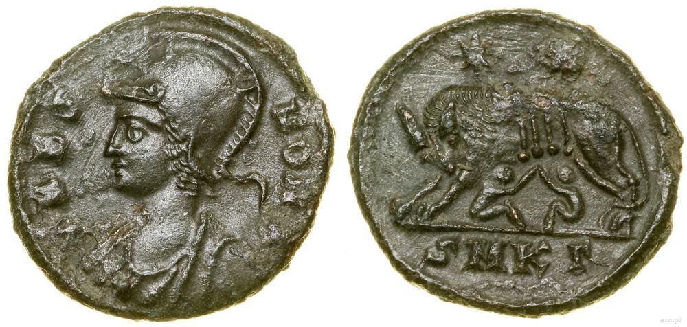 Opis: | Cesarstwo Rzymskie - Konstantyn I Wielki (307–337), follis, (331–334), Cyzicus, Aw: Popiersie Romy w lewo, VRBS ROMA, Rw: Wilczyca karmiąca ludzkie bliźnięta, u góry dwie gwiazdy, w odcinku SMKΓ |