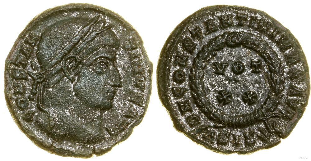 Opis: | Cesarstwo Rzymskie - Konstantyn I Wielki (307–337), follis, (321–324), Siscia, Aw: Głowa cesarza w wieńcu w prawo, CONSTANTINVS AVG; Rw:W wieńcu laurowym VOT XX, w otoku D N CONSTANTINI MAX AVG, u dołu ASIS (promienisty łuk) |