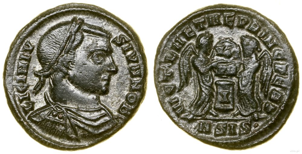 Opis: | Cesarstwo Rzymskie - Licyniusz II (317–324) - jako cezar, follis, (319), Siscia, Aw: Głowa cesarza w prawo, LICINIVS IVN NOB C, Rw: Dwie Wiktorie stojące naprzeciw siebie, trzymające tarczę z napisem VOT / PR, VICTORIAE LAETAE PRINC PERT, w odcinku •ASIS• |