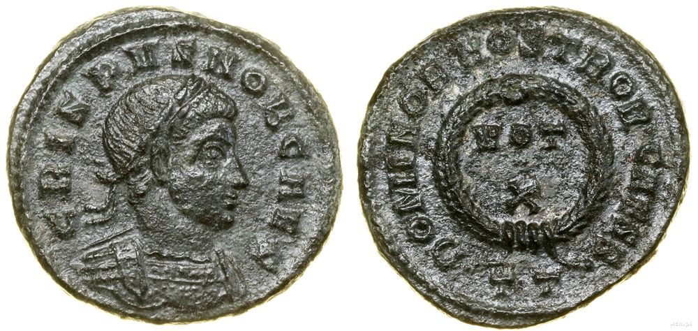 Opis: | Cesarstwo Rzymskie - Kryspus (317–326), follis, (322–325), Ticinum, Aw: Popiersie cesarza w prawo, CRISPVS NOB CAES, Rw: W wieńcu VOT / X, DOMINOR NOSTROR CAESS, w odcinku TT |
