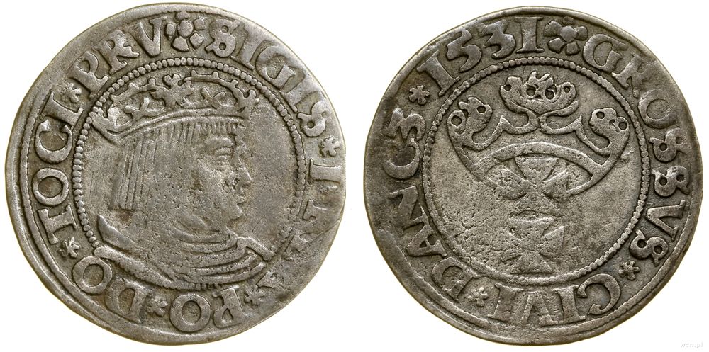 Opis: | Polska - Zygmunt I Stary (1506–1548) - miasto Gdańsk, grosz, 1531, Gdańsk, na awersie końcówka legendy PRV, rozeta rozpoczyna legendę awersu |