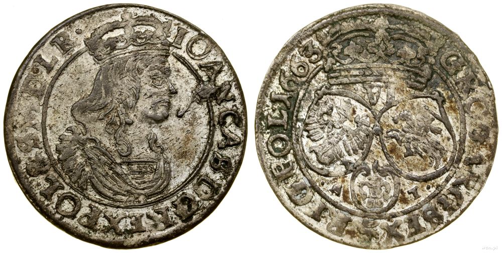 Opis: | Polska - Jan II Kazimierz Waza (1649–1668) - monety koronne, szóstak, 1663 AT, Kraków, Ślepowron na rewersie, obwódki po obu stronach monety, herb Wazów w okrągłej tarczy |