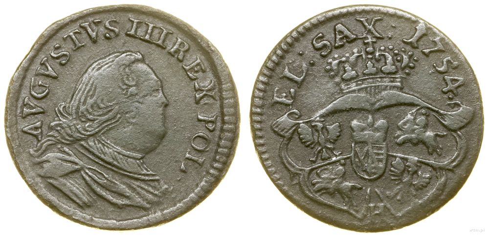 Opis: | Polska - August III (1733–1763) - monety polsko-saskie, grosz (3 szelągi), 1754 H, Gubin |