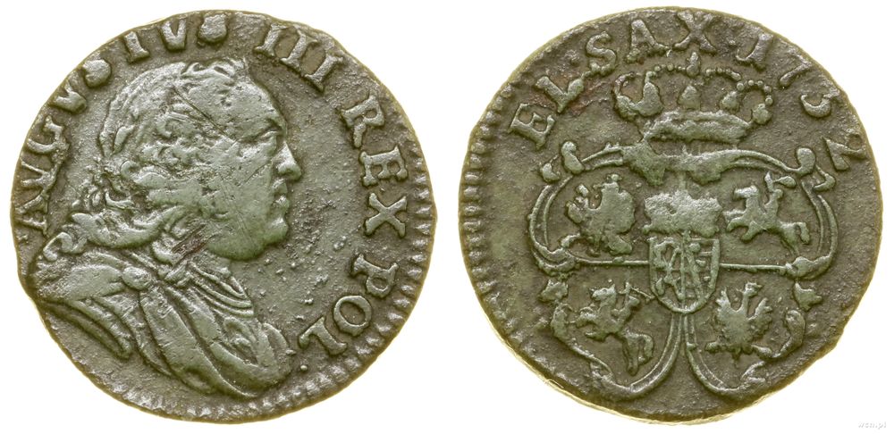 Opis: | Polska - August III (1733–1763) - monety polsko-saskie, szeląg, 1752, Grünthal |