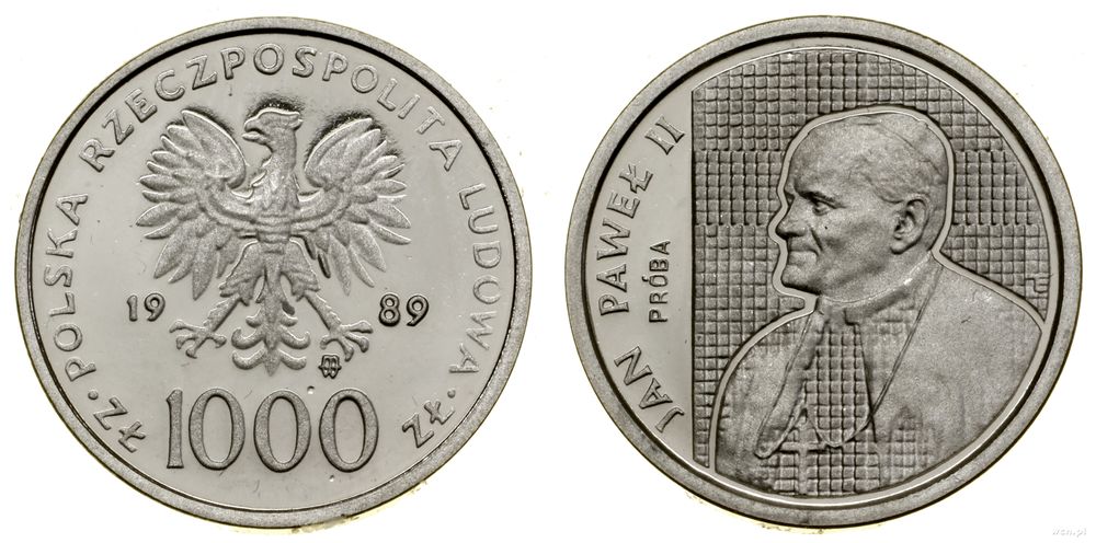 Opis: | Polska - Polska Rzeczpospolita Ludowa (1952–1989) - monety próbne, 1.000 złotych, 1989, Warszawa, Jan Paweł II /popiersie na tle kratki/, PRÓBA NIKIEL |