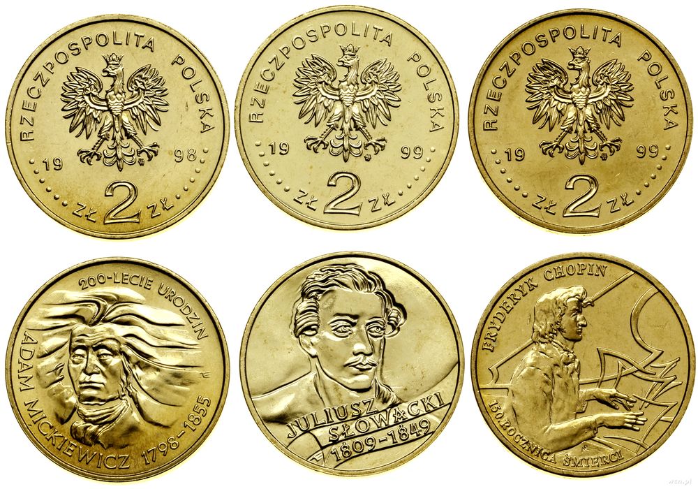 Opis: | Polska - III Rzeczpospolita Polska (od 1989) - monety obiegowe, zestaw 3 x 2 złote, Warszawa, 200-lecie urodzin Adama Mickiewicza (z dywizem) (1998), Juliusz Słowacki (1999), 150. Rocznica Śmierci Fryderyka Chopina (1999) |