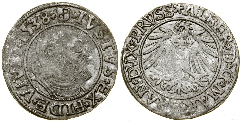 Opis: | Prusy Książęce (1525–1657) - Albert Hohenzollern (1525–1568), grosz, 1538, Królewiec, końcówka legendy rewersu PRVSS |