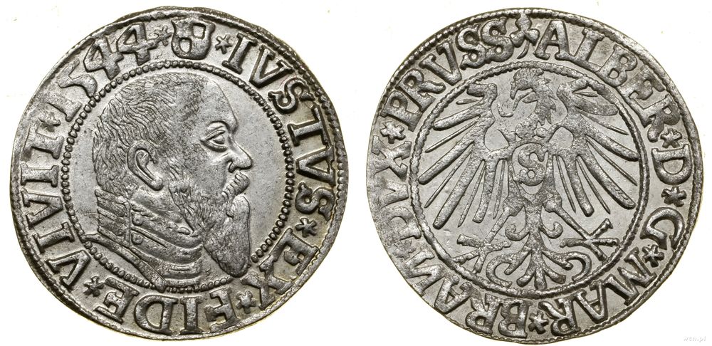 Opis: | Prusy Książęce (1525–1657) - Albert Hohenzollern (1525–1568), grosz, 1544, Królewiec, popiersie księcia z wysokim kołnierzem, końcówka legendy rewersu PRVSS, trójlistek z ogonkiem |