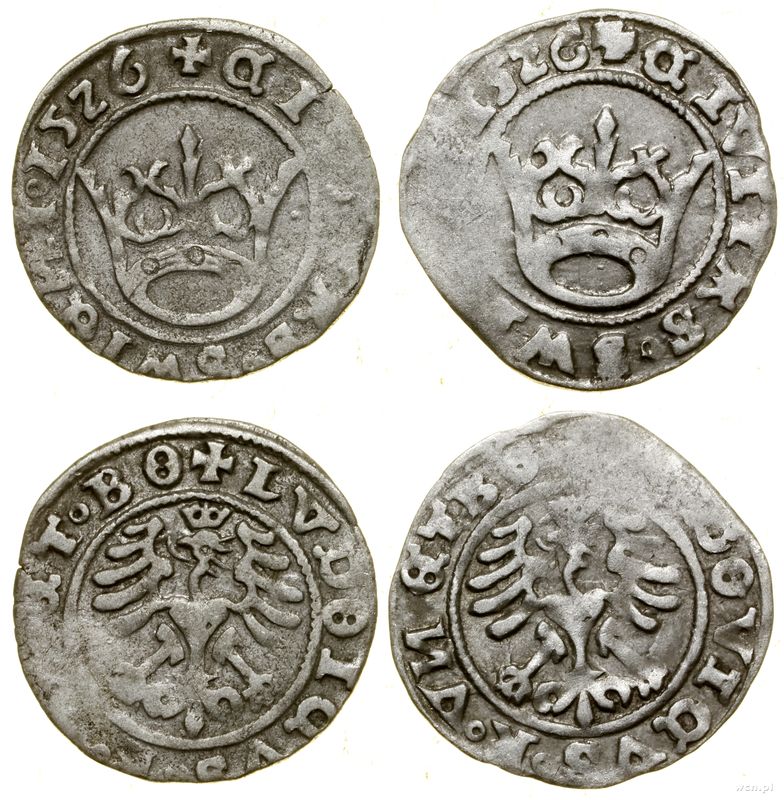 Opis: | Śląsk - miasto Świdnica - Ludwik Jagiellończyk jako król Czech i Węgier (1516–1526), zestaw: 2 x półgrosz miejski, 1526, Świdnica |