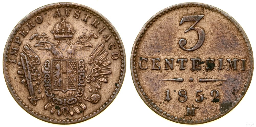 Opis: | Austria - Franciszek Józef I (1848–1916), 3 centisimi, 1852 M, Mediolan |