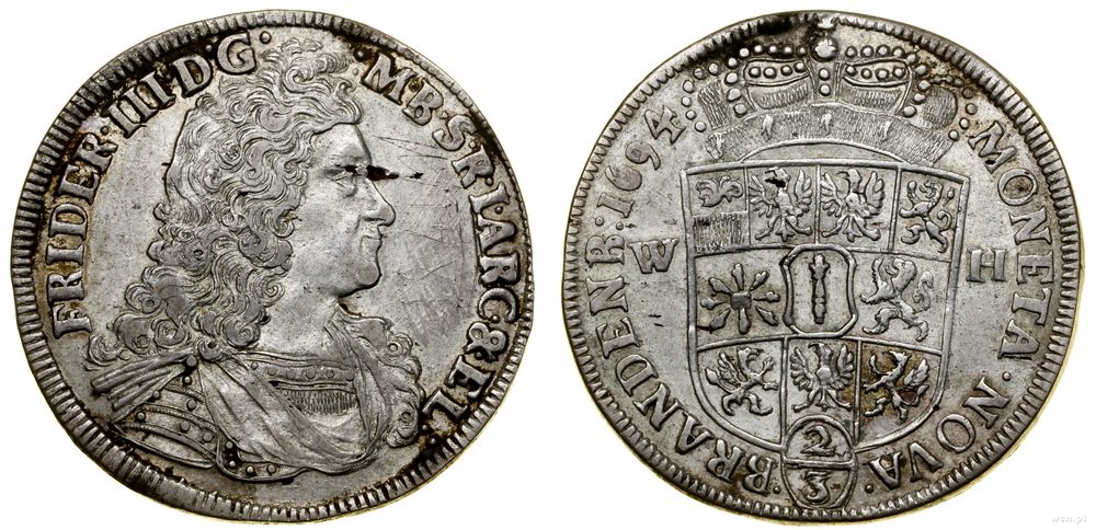 Opis: | Niemcy - Brandenburgia-Prusy - Fryderyk III (1688–1701), 2/3 talara (gulden), 1694 W-H, Emmerich |
