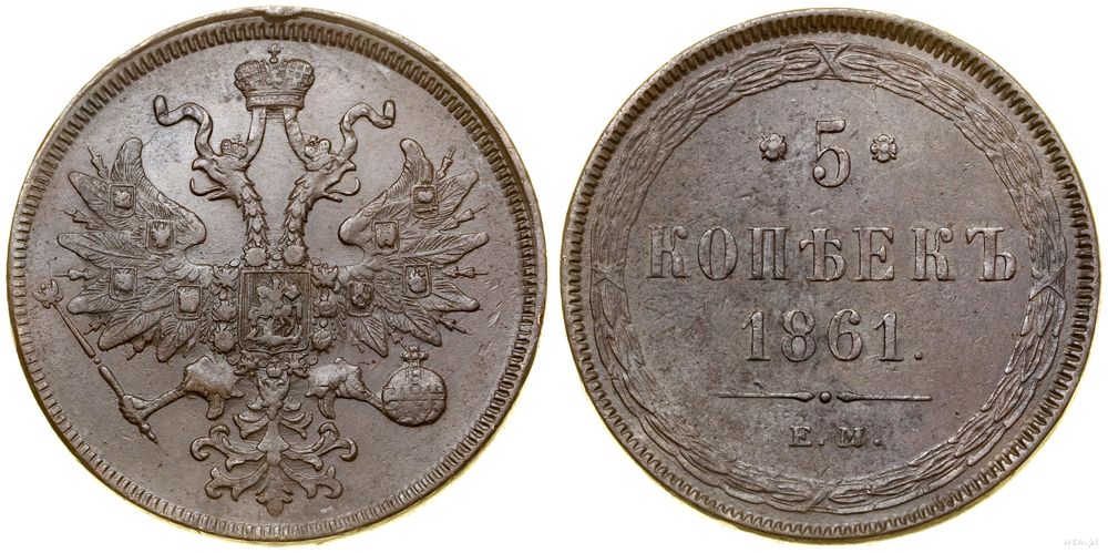 Opis: | Rosja - Aleksander II (1855–1881), 5 kopiejek, 1861 EM, Jekaterinburg, św. Jerzy bez włóczni |