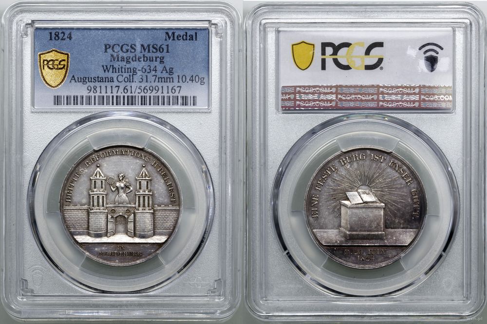 Dodatkowe informacje: | minimalnie przetarty medal, subtelna patyna, pięknie zachowany, z kolekcji Augustiana , w opakowaniu firmy PCGS nr 981117.61/56991167 z oceną MS61 |