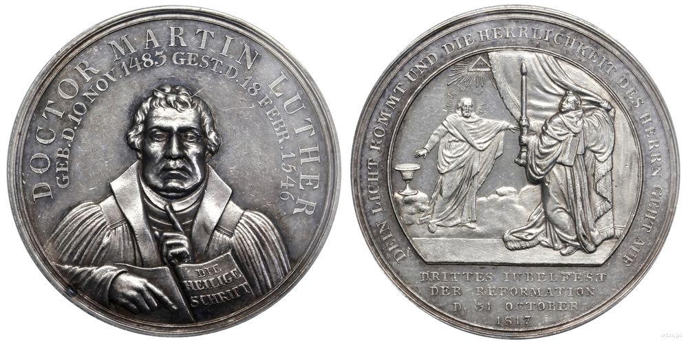 Opis: | Niemcy - XIX wiek, 300. rocznica Reformacji w Berlinie, 1817, Aw: Popiersie Marcina Lutra w płaszczu, trzymający Pismo Święte, DOCTOR MARTIN LUTHER GEB D 10 NOV 1483 GEST D 18 FEBR 1546; Rw: Chrystus stojący za zasłoną podniesioną przez Marcina Lutra, DEIN LICHT KOMMT UND DIE HERRLICHKEIT DES HERRN GEHT AUF, u dołu DRITTES IUBEL FEST DER REFORMATION D 31 OCTOBER 1817 |