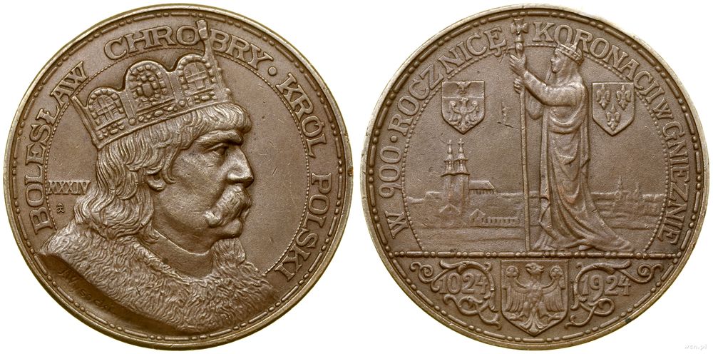 Opis: | Polska - II Rzeczpospolita Polska (1918–1939), 900. Rocznica Koronacji Bolesława Chrobrego, 1924, Warszawa, Aw: Popiersie w prawo, na odcięciu ramienia sygnatura J. Wysocki, BOLESŁAW CHROBRY KRÓL POLSKI; Rw: Polonia stojąca na tle panoramy Gniezna, w polu dwie tarcze herbowe, poniżej Orzeł Piastowski i daty 1024 - 1924, W 900•ROCZNICĘ KORONACJI W GNIEŹNIE, projektował Jan Wysocki |