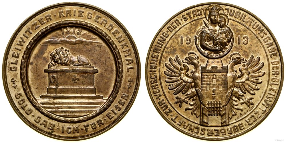 Opis: | Śląsk - Gliwice, Medal na pamiątkę osłonięcia pomnika z okazji 100-nej rocznicy Bitwy Narodów, 1913, Aw: Pomnik śpiącego lwa, wyżej zachodzące słońce i data 1813, GLEIWITZER KRIEGERDENKMAL GOLD GAB ICH FUR EISEN; Rw: Herb Gliwic, z boków 19-13, JUBILÄUMSGABE DER GLEIWITZER BÜRGERSCHAFT ZUR VERSCHÖNERUNG DER STADT |