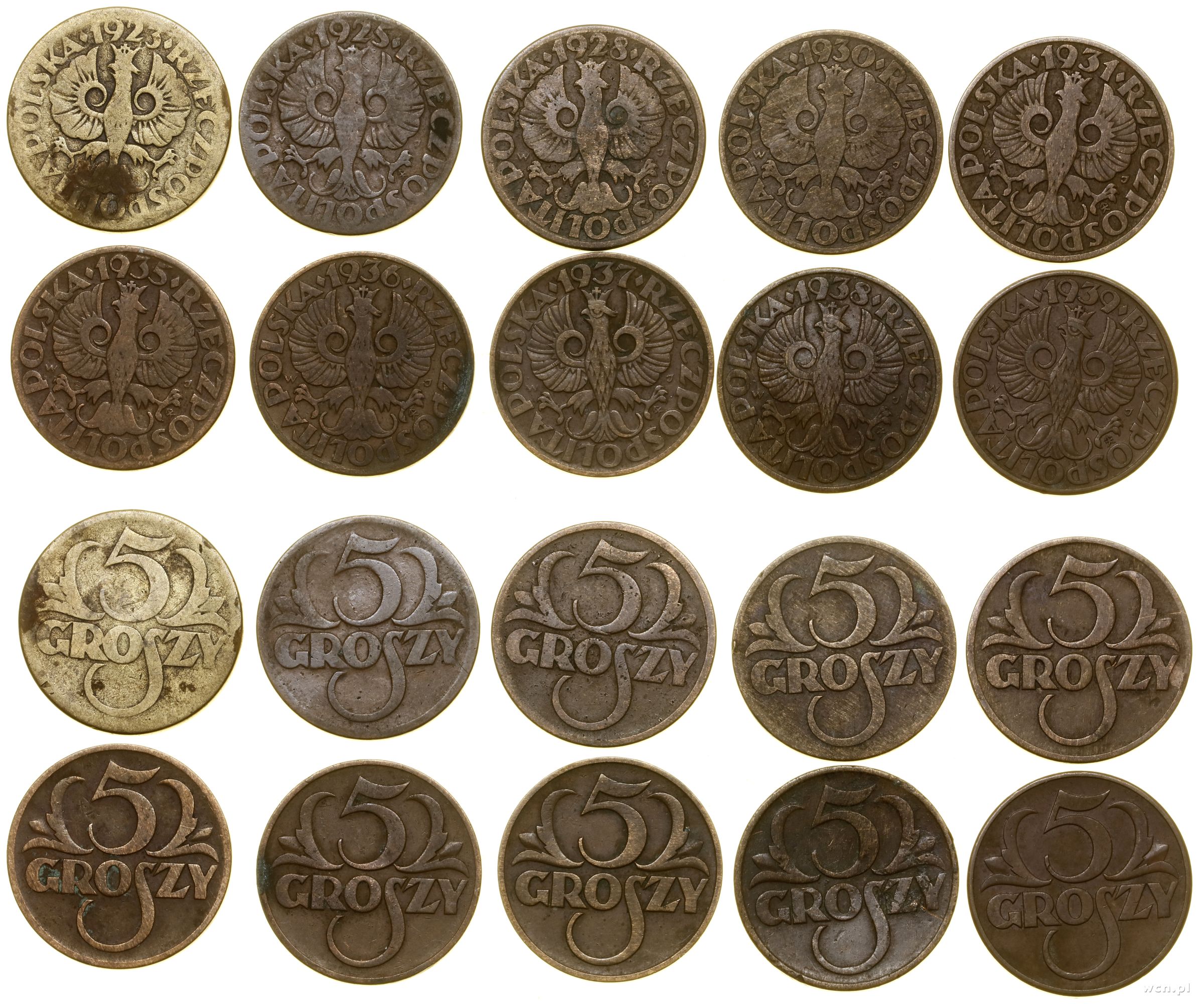 Polska, zestaw: 10 x 5 groszy, 1923–1939