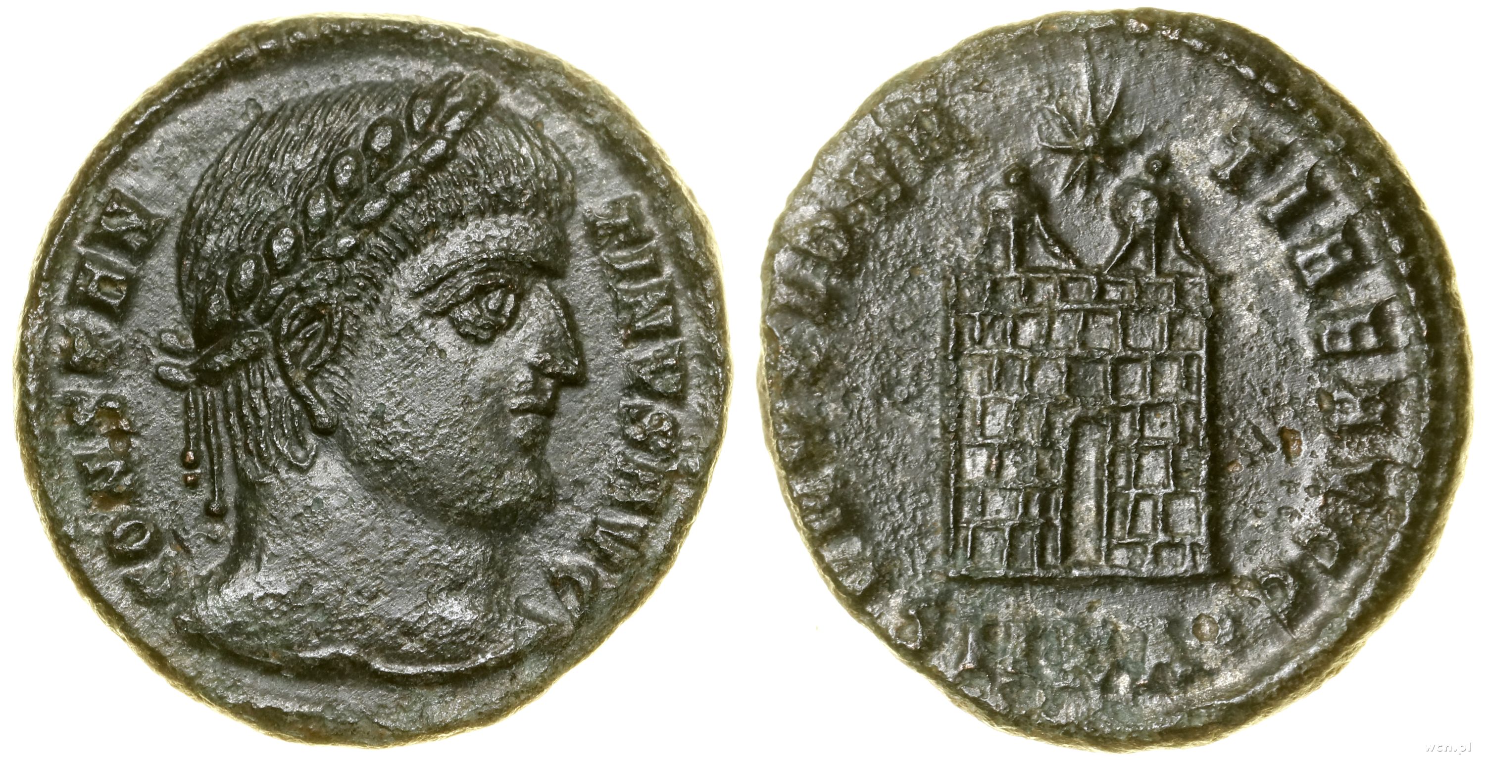 Aw: Głowa Konstantyna w prawo, CONSTANTINVS AVG, Rw: Bram... | II- |