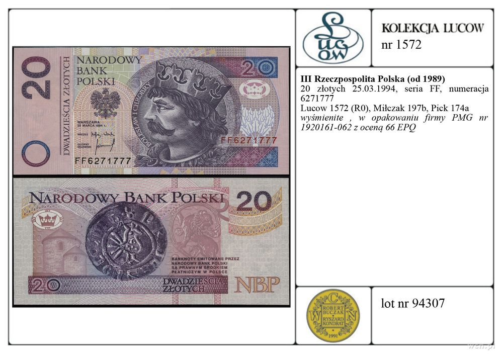 | Opis: | Polska - III Rzeczpospolita Polska (od 1989), 20 złotych, 25.03.1994, seria FF, numeracja 6271777 |