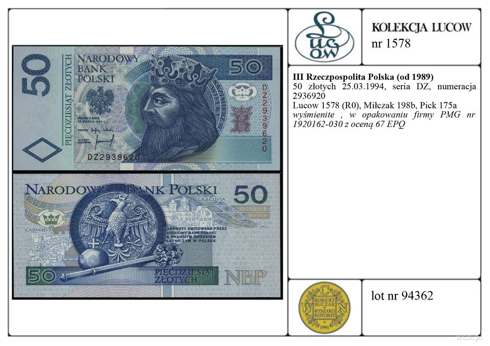 | Opis: | Polska - III Rzeczpospolita Polska (od 1989), 50 złotych, 25.03.1994, seria DZ, numeracja 2936920 |