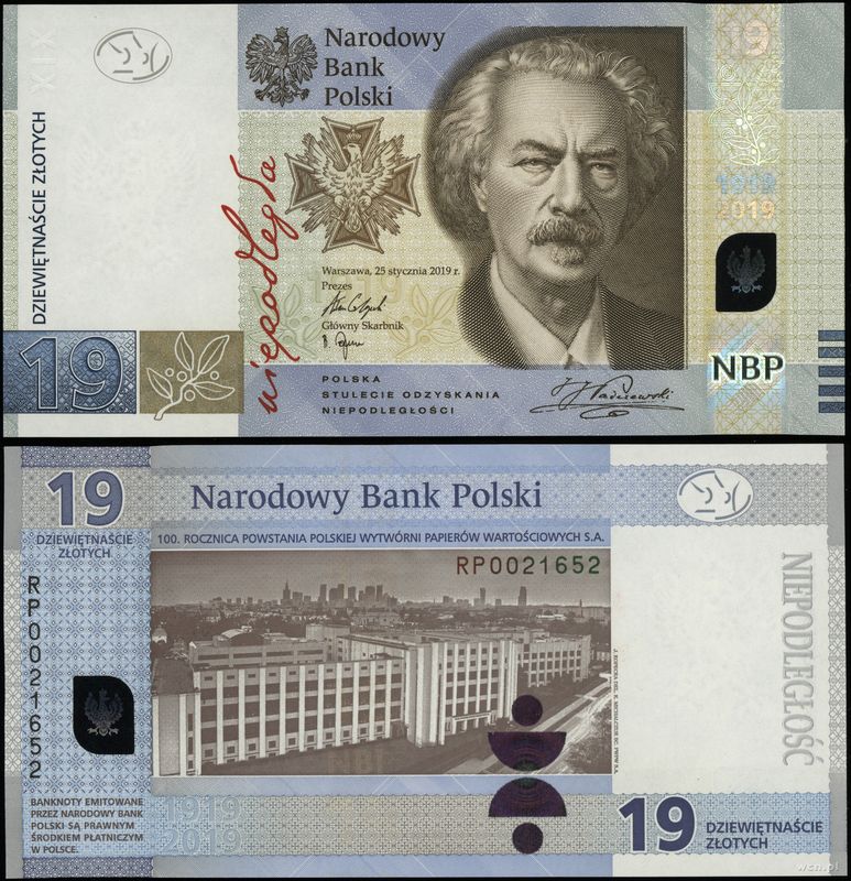 | Opis: | Polska - III Rzeczpospolita Polska (od 1989), 19 złotych, 25.01.2019, 100. rocznica powstania Polskiej Wytwórni Papierów Wartościowych / Ignacy Jan Paderewski, seria RP, numeracja 0021652 |