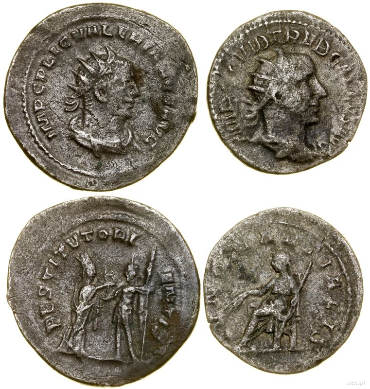| Opis: | Cesarstwo Rzymskie - różni cesarze, zestaw 2 monet, Trebonian Gallus (251–253), antoninian bilonowy (251–253), Mediolan / Walerian I (253–260), antoninian bilonowy, (255–256), Antiochia |