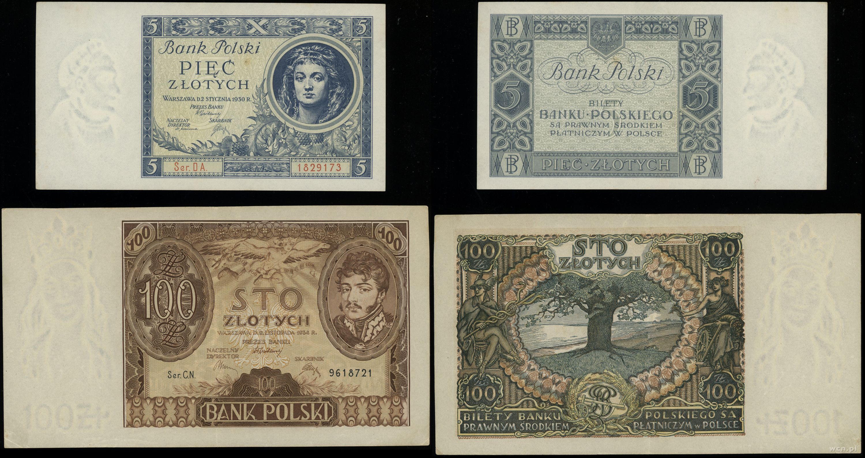 1) 5 złotych 2.01.1930 seria DA (st. II-) 2) 100 złotych ... | II+/II- |