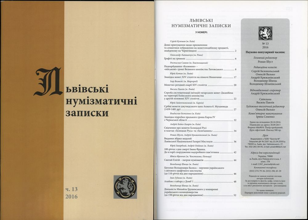 | Dodatkowe informacje: | 52 strony formatu A4, wewnątrz artykuły dotyczące m.in. grafiti na srebrnych grzywnach, kontramarek z kolumną Giedymina, skarbu monet z XIV wieku z okolic Winnicy, próby typologii naśladownictw monet Złotej Ordy z terytorium księstwa kijowskiego, srebrnych monet chana Ahmada Muhammada, znaleziska fałszywego grosza praskiego Karola IV czy 100. rocznicy śmierci Iwana Franka |
