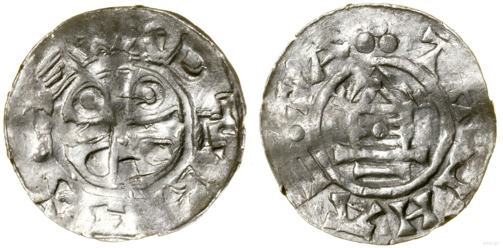 | Opis: | Niemcy - Saksonia - Otto III (983–1002), naśladownictwo denara typu OAP, (983–1002), Aw: Krzyż, w kątach O-D-D-O, fragmenty napisu DI GRA REX; Rw: Kaplica z poziomymi belkami, wewnątrz kulka, wstecznie ATEAHLHT |
