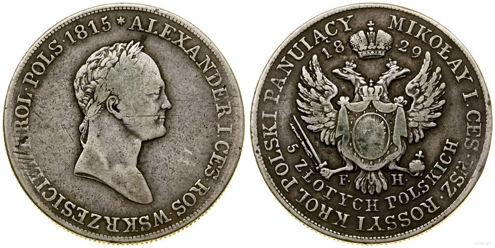| Opis: | Polska - Królestwo Kongresowe (1815–1835) - Mikołaj I (1825–1855), 5 złotych, 1829 FH, Warszawa, inicjały FH pod Orłem (mincerz Fryderyk Hunger) |
