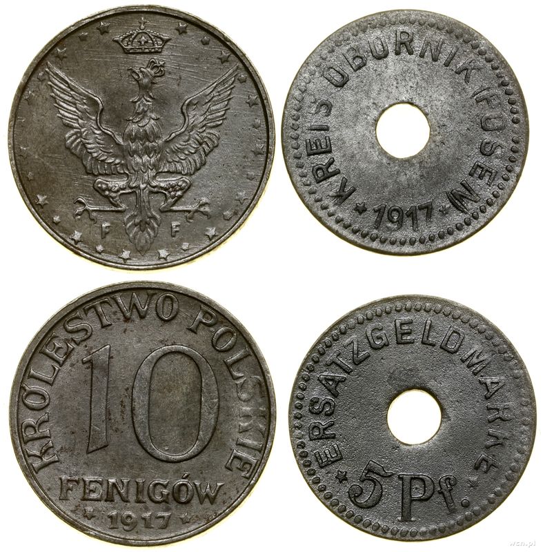 | Opis: | Polska, zestaw 2 monet, 5 fenigów 1917 - Oborniki - pieniądz zastępczy / 10 fenigów 1917 F, Stuttgart, Monety niemieckich władz okupacyjnych dla Królestwa Polskiego |