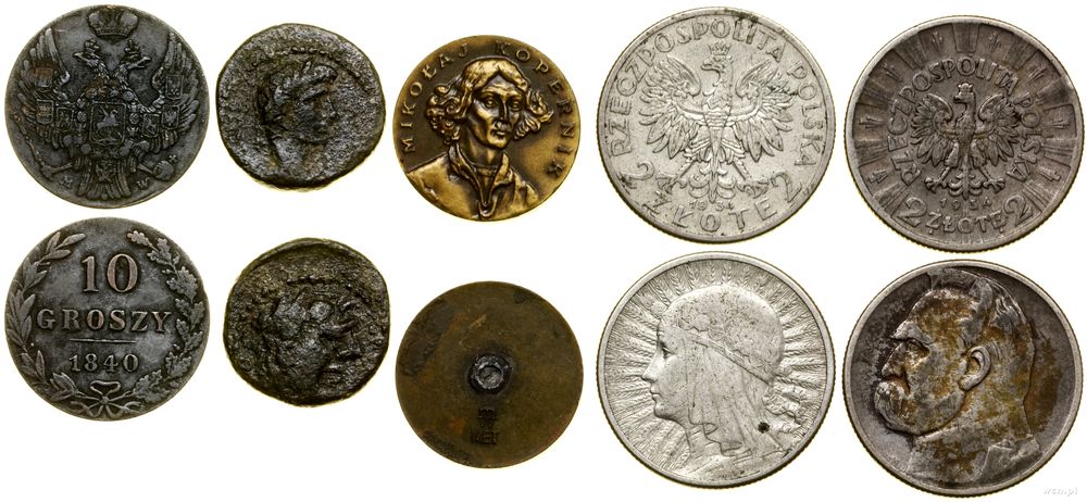 | Opis: | Polska, zestaw 5 przedmiotów, brąz, Rzym prowincjonalny / 10 groszy 1840 MW (Warszawa) / 2 złote 1934, Warszawa, głowa kobiety w czepcu / 2 złote 1934, Warszawa, Józef Piłsudski / odznaka - Mikołaj Kopernik |