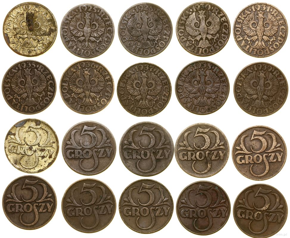 Polska, zestaw: 10 x 5 groszy, 1923–1939