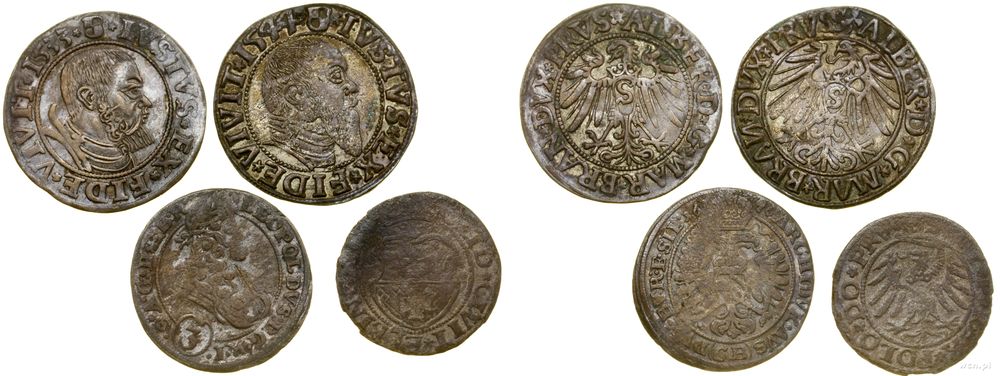 | Opis: | różne, zestaw 4 monet, 1) szeląg z nieczytelną datą, Elbląg (Zygmunt I Stary) 2) grosz 1533, Królewiec (Prusy Książęce) 3) grosz 1544, Królewiec (Prusy Książęce) 4) 3 krajcary 1696, Brzeg (Śląsk pod panowaniem habsburskim) |