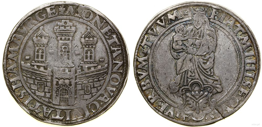 | Opis: | Niemcy - Hamburg – miasto, talar, 1553, Hamburg, Aw: Mury miejskie, legenda, Rw: Madonna z Dzieciątkiem, legenda |
