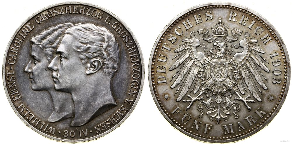| Opis: | Niemcy - Saksonia-Weimar-Eisenach - Wilhelm Ernest (1901–1918), 5 marek pamiątkowe, 1903 A, Berlin, wybita z okazji ślubu księcia z Karoliną von Reuss / Auf die Vermählung des Groβherzogs mit Prinzessin Caroline Reuβ am April 1903 |