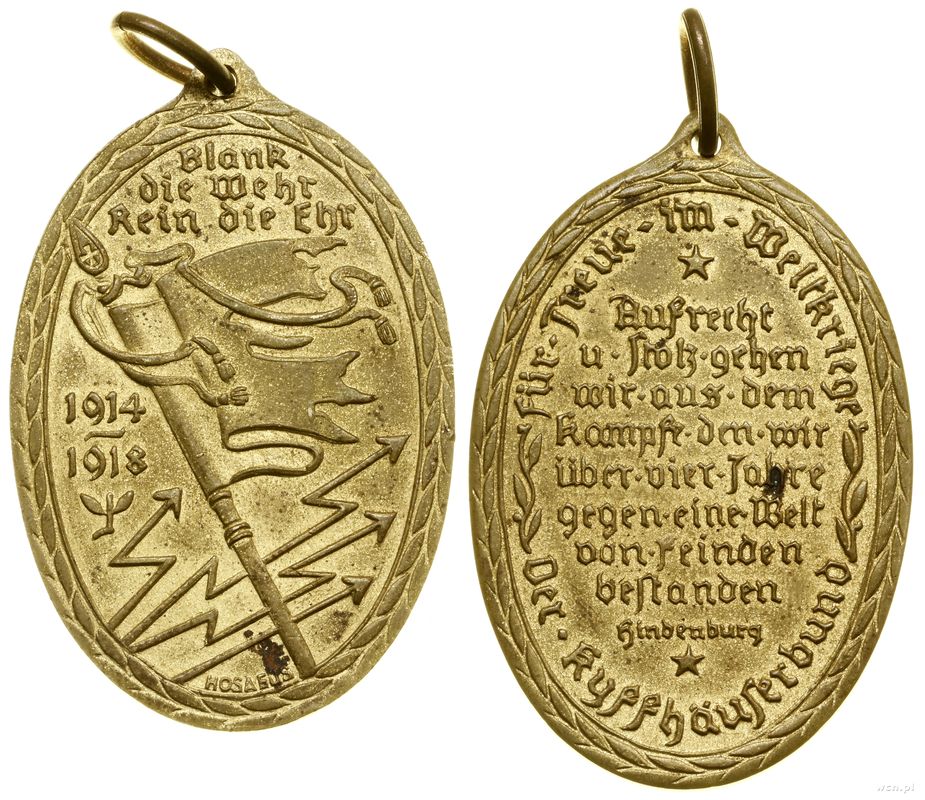 | Opis: | Niemcy - Republika Weimarska (1918–1933), Medal Pamiątkowy Kyffhäuser (Kyffhäuser-Kriegsdenkmünze), 1922–1934, Wieniec, w którym proprzec i cztery pioruny, po lewej 1914 / 1918, u góry Blank / die Wehr / Rein die Ehr, na dole sygnatura HOSAEUS, na stronie odwrotnej Aufrecht / u. Stolz. gehen / wir aus dem / Kampfe den wir / über vier Jahre / gegen eine Welt / von Feinden / bestanden / Hindenburg, Für- • Treue • im • Weltkriege - Der • Kyffhäuserbund, odznaczenie jednoczęściowe, mocowane na wstążkę, brak wstążki |