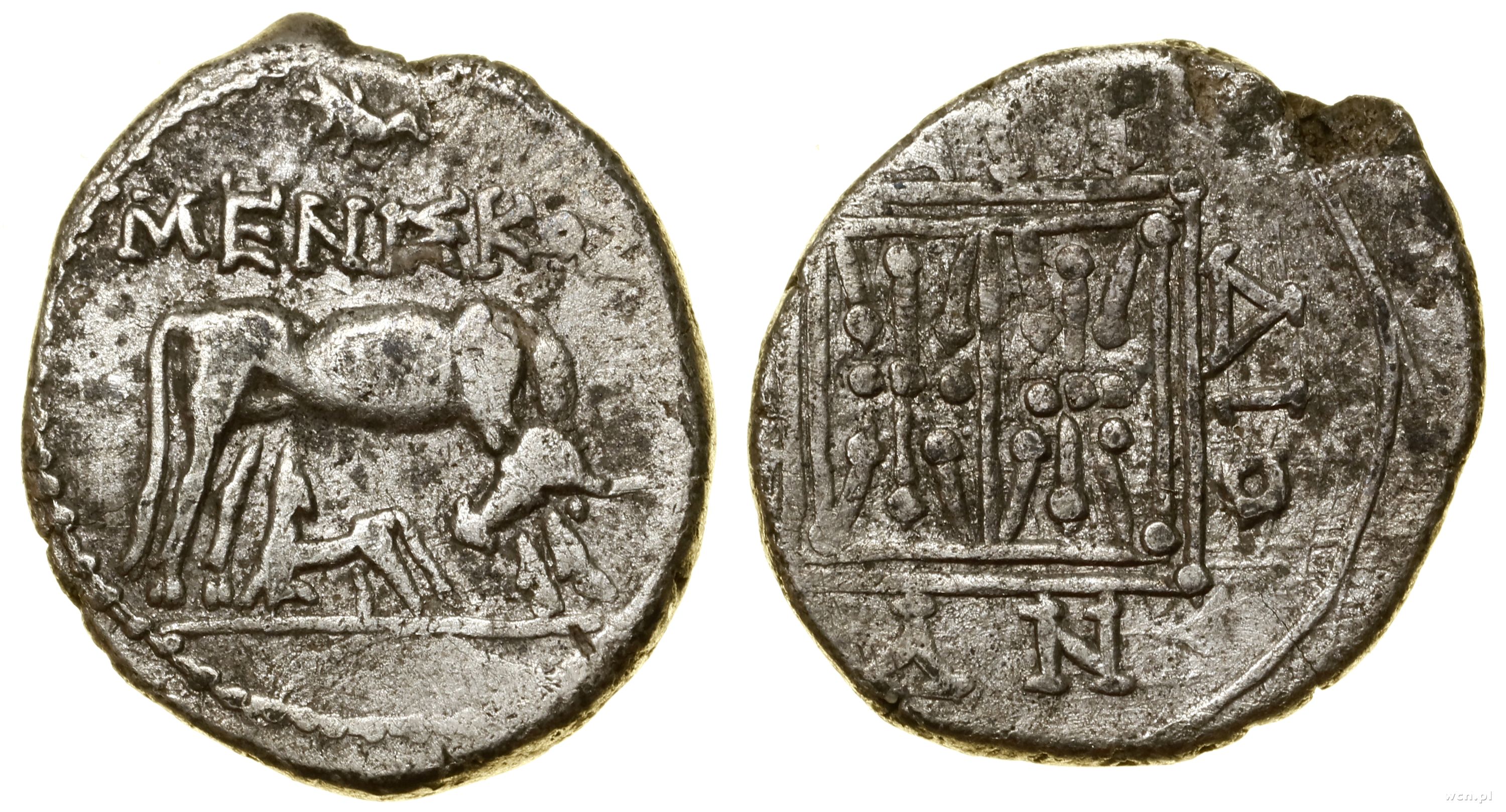 Aw: Krowa stojąca w prawo, karmiąca cielę, powyżej ΜΕΝΙΣΚ...  | III- |