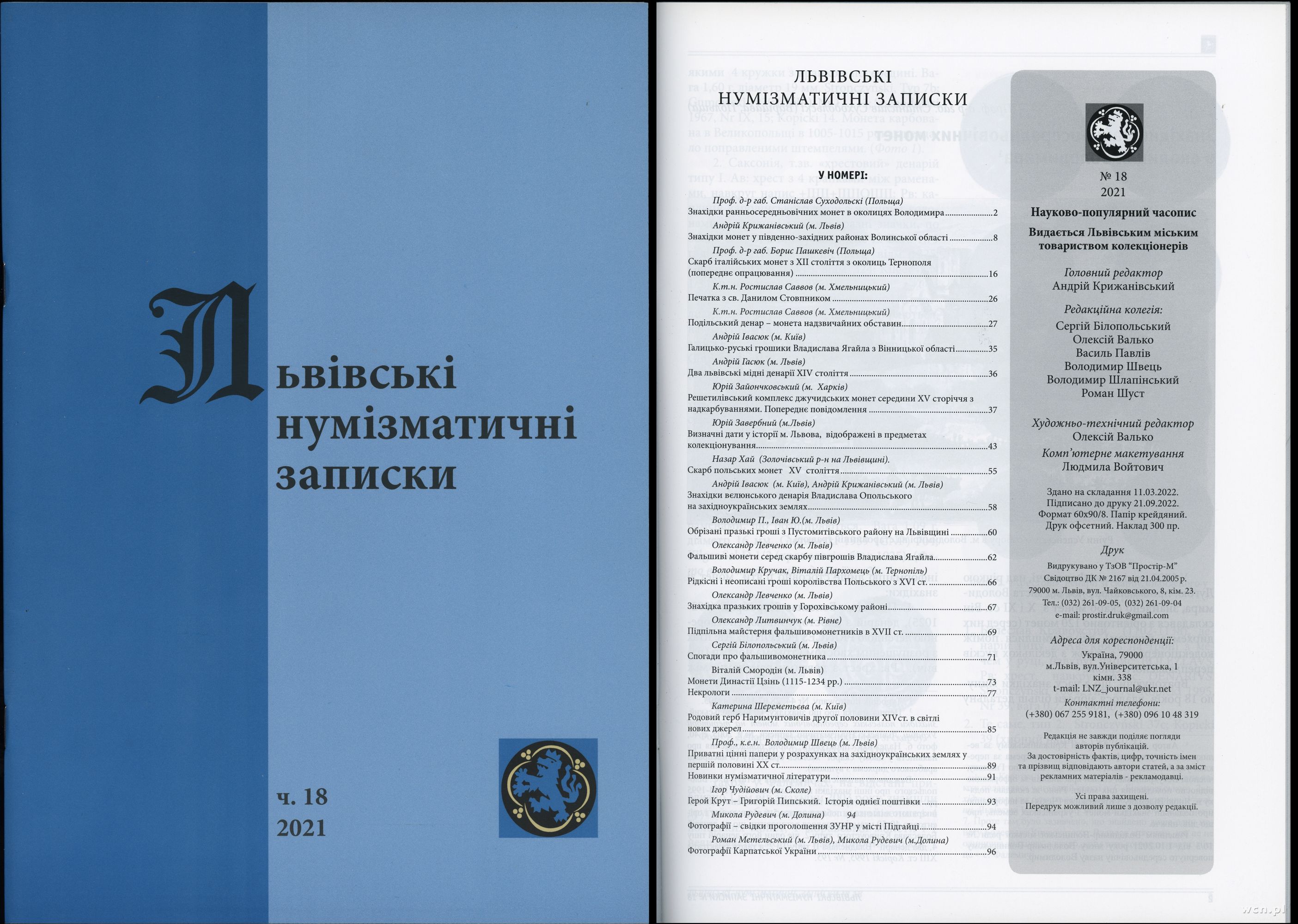 czasopisma, Львiвськi нумiзматичнi записки (Lwowskie Zapiski Numizmatyczne), nr 18/2021
