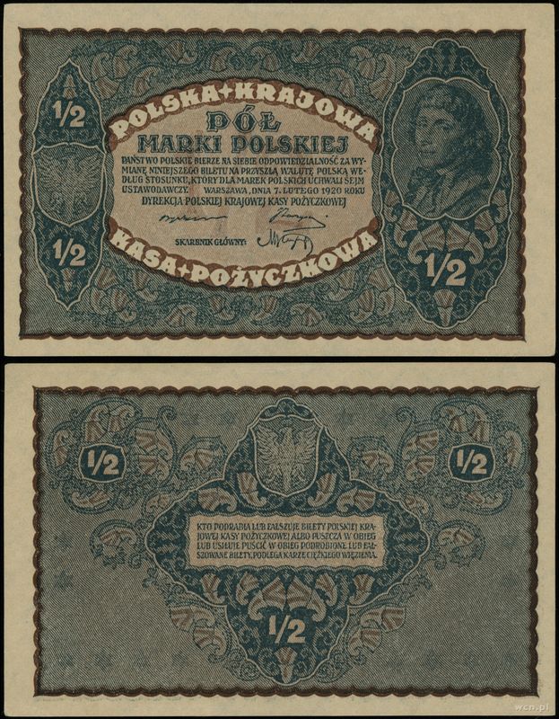 | Opis: | Polska - II Rzeczpospolita Polska (1918–1939) - emisje przed reformą Władysława Grabskiego, 1/2 marki polskiej, 7.02.1920, bez oznaczenia serii i numeracji |