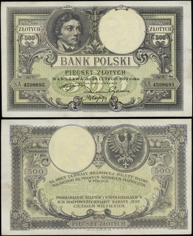 | Opis: | Polska - II Rzeczpospolita Polska (1918–1939) - emisje po reformie Władysława Grabskiego, 500 złotych, 28.02.1919, seria A, numeracja 4598695 |