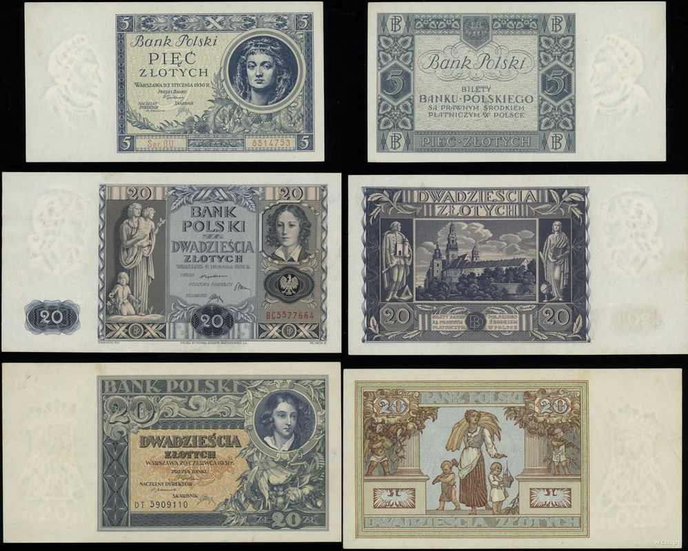 | Opis: | Polska - II Rzeczpospolita Polska (1918–1939) - emisje po reformie Władysława Grabskiego, zestaw 3 banknotów, 1930–1936, 1) 5 złotych 2.01.1930 seria DU 2) 20 zlotych 20.06.1931 seria DT 3) 20 złotych 11.11.1936 seria BC |