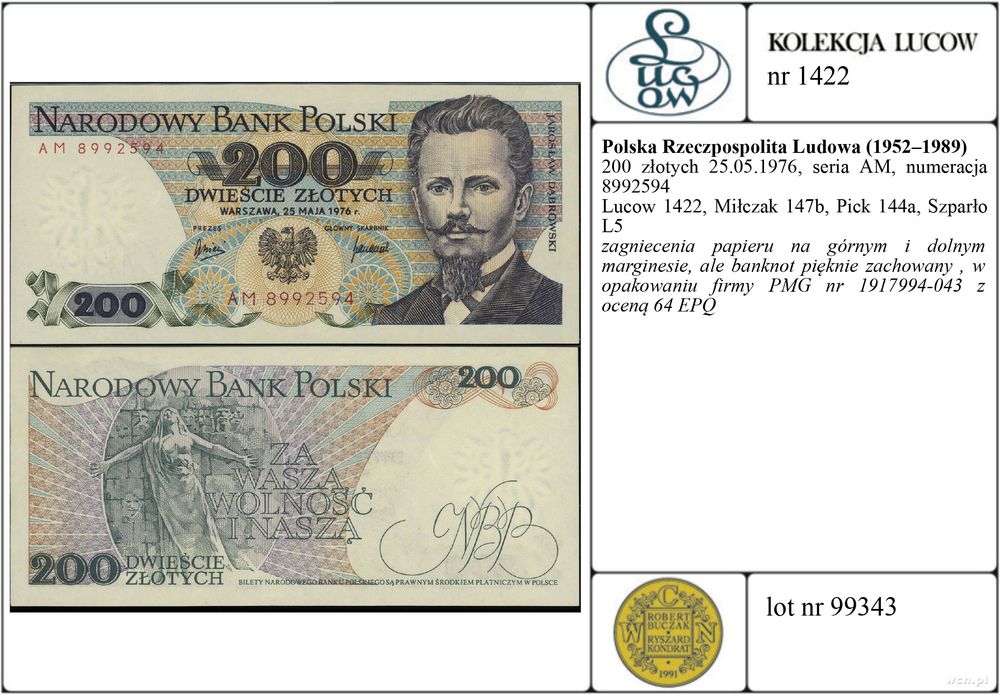 | Opis: | Polska - Polska Rzeczpospolita Ludowa (1952–1989), 200 złotych, 25.05.1976, seria AM, numeracja 8992594 |