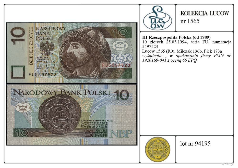 | Opis: | Polska - III Rzeczpospolita Polska (od 1989), 10 złotych, 25.03.1994, seria FU, numeracja 5597523 |