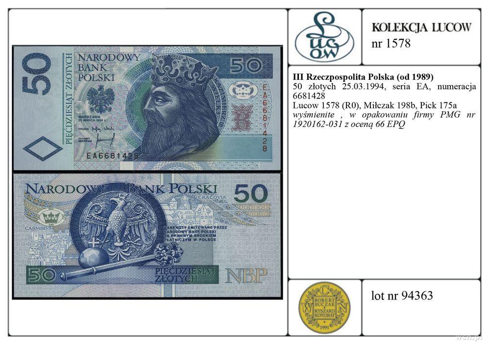 | Opis: | Polska - III Rzeczpospolita Polska (od 1989), 50 złotych, 25.03.1994, seria EA, numeracja 6681428 |