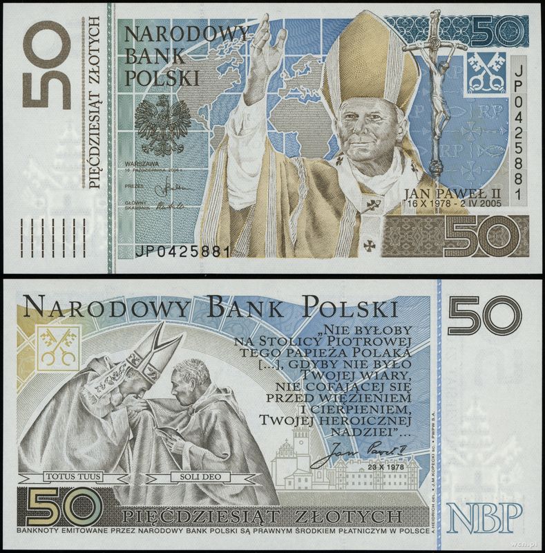 | Opis: | Polska - III Rzeczpospolita Polska (od 1989), 50 złotych, 16.10.2006, Jan Paweł II, seria JP, numeracja 0425881 |